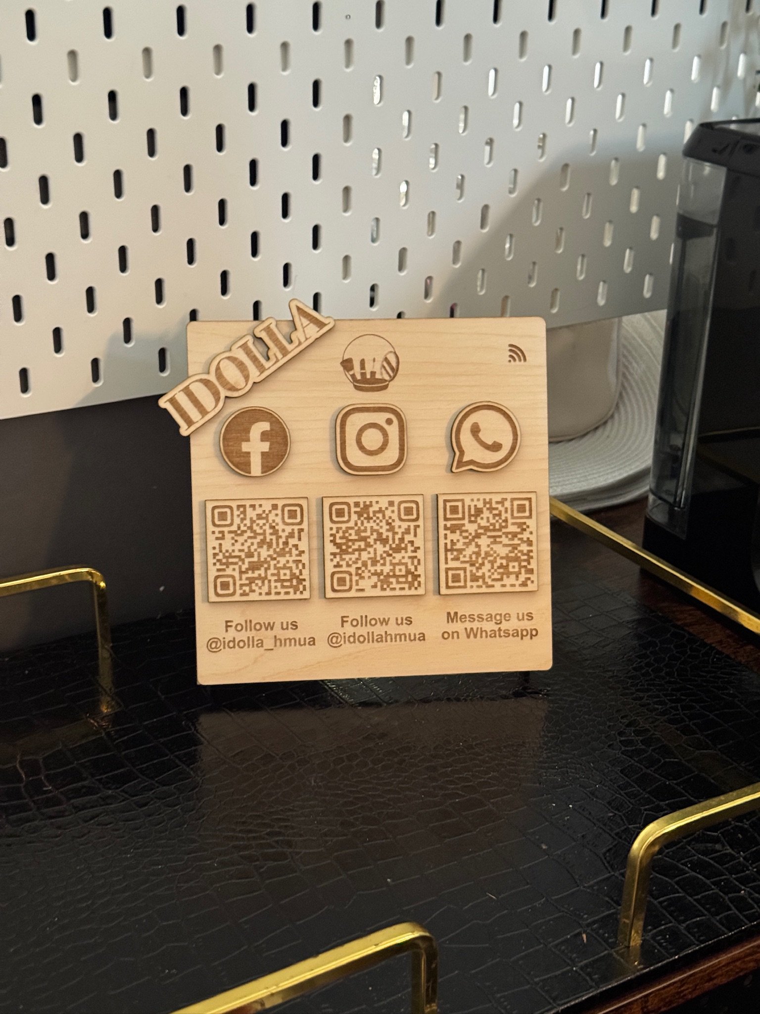 Level up your brand presence with this stylish, laser cut and custom-engraved smart business display stand. Designed for salons, shops, market stalls, and pop-up creators — with custom QR codes to link directly to your socials, booking page, or payment platforms.